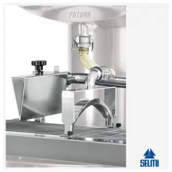 Features two-section covering belt, mechanical vibration and double chocolate curtain. Interchangeable corrosion-resistant aluminum plate. Dual veil chocolate coating hopper. Supporting rotating table synchronised with the coating belt.