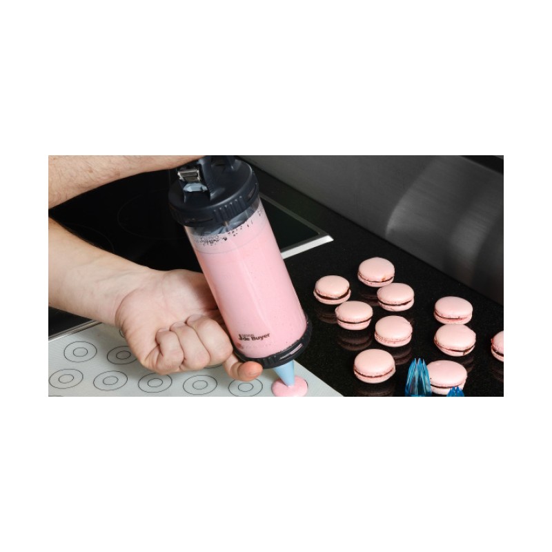 Pressure syringe for effortless dosing of paste, creams and mousses. For garnishing, filling and decorating. Simple,fast and accurate work. Easier to fill than a pastry bag. 0,75 L. capacity in transparent plastic. Graduated in cl and oz. Allows the user to see how much is left. Knob for easy setting of pressure for dosing the amount to be poured (from 1 to 5 cl). Removable and interchangable nozzles. Made in France