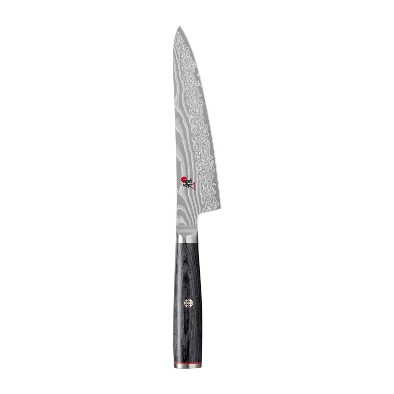 The MIYABI Kaizen II FC61 collection represents a step closer to perfection. These knives are forged from resilient FC61 fine carbide steel, protected by 49 layers of Damascus steel, and finished with a darkened acid dip that adds both beauty and durability. The blades undergo a double FRIODUR® ice-hardening process, enhancing their corrosion resistance and toughness. Each knife is meticulously hand-honed using the four-step Honbazuke method, resulting in a blade of extraordinary sharpness and precision. The black pakkawood handle, elegantly stamped with a mosaic pin and accented with a decorative red spacer, provides a comfortable, ergonomic grip. Handcrafted in Seki, Japan, the MIYABI Kaizen II FC61 series offers the perfect balance of traditional craftsmanship and modern innovation, making it an essential tool for the refined chef.